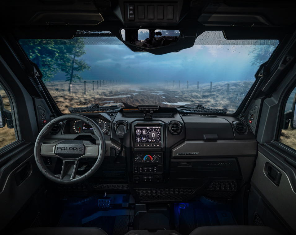 Premium Pro-Shield Cab, Doors with Full Power Windows, Fixed Glass Windshield with Wiper, Rear Glass Panel, Dome Light, Door Puddle Lighting, Interior Accent Lighting, Rearview Mirror, Heat, AC, Defrost. Premium Contoured Seats with Additional Bolstering, Premium Headrests and Center Armrest. Premium, Telescoping Steering Wheel and Painted Interior Accents. Polaris Pulse Electrical System (6 position), Overhead Switch Panel, Roof Pulse Bar (6 position), 140 Amp Charging System, Front Bumper, DC Outlet, USB Charge Port, Trickle Charger, 12V Located in the Cargo Box with In-Dash On/Off Switch, NFC Front Badge, NorthStar Badge. Polaris HD 6,500 Lb. Synthetic Rope Winch with Autostop and Wireless Remote.