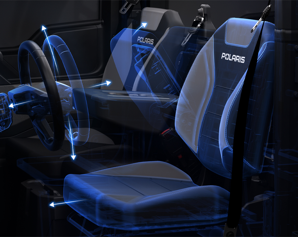 3-person, superior contoured and bolstered bench seat with 3-point harness, adjustable driver seat, and flip-down arm rest