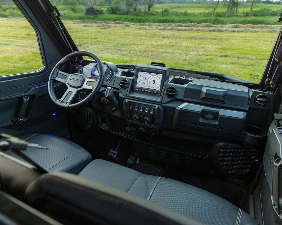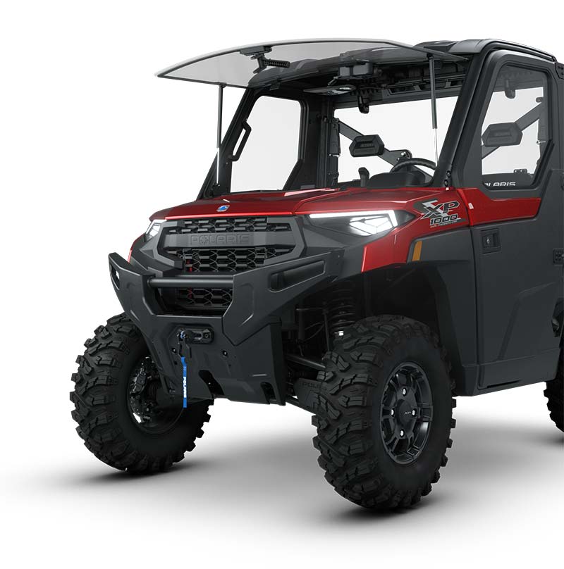 Premium Pro-Shield Cab w/ Roof; Doors with Powered Front Windows; Full Glass Tip-out Windshield with Wiper; Rear Glass Panel; Factory-Installed Heat, AC, Defrost; Rearview Mirror; Premium Steering Wheel and Interior Accents; NorthStar Tailgate Badge; Front Bumper with Integrated Winch, Plow & LED Mounts; Premium Cut & Sew Seats with Contoured Seatbacks and Embroidered Polaris Branding; 2,040 kg Winch with synthetic rope, Auto Stop and wireless remote; Polaris Pulse Electrical System (6-Position) Underhood Busbar and 6-Position Roof Busbar; 12V Accessory Outlet; Battery Trickle-Charging Outlet; USB Outlet, Factory-installed cab system with powered doors, roof, glass tip-out windshield, glass rear panel, rearview mirror, windshield wiper/washer, and sound insulation materials.